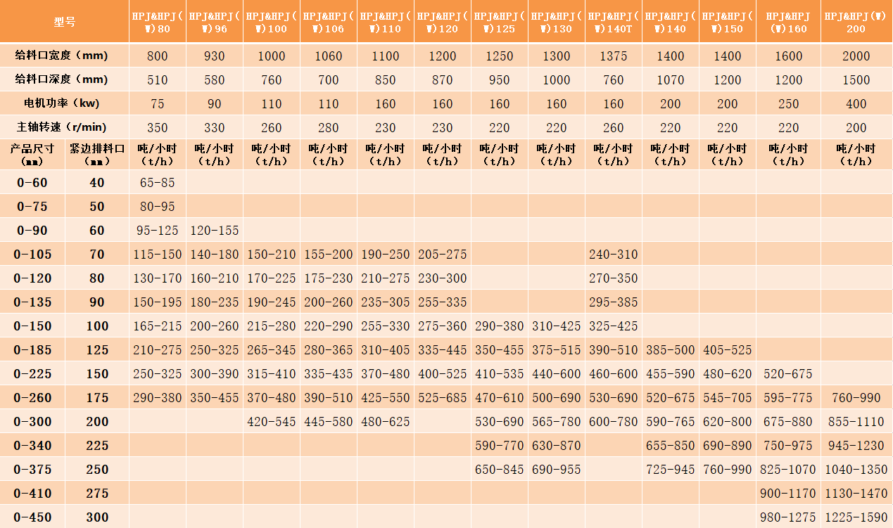 HPJ系列顎式破碎機型號及技術參數: