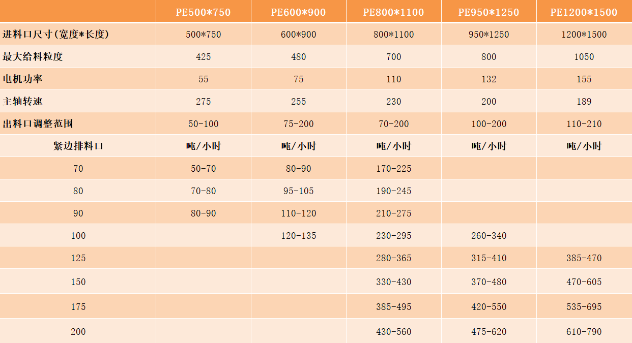 PE系列顎式破碎機型號及技術參數: